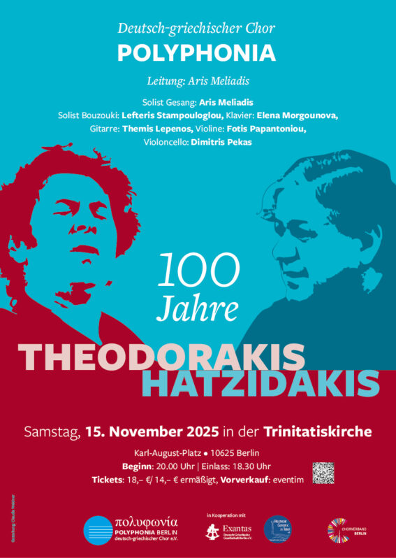 Το Σάββατο 15 Νοεμβρίου 2025, η ελληνογερμανική χορωδία Polyphonia, υπό τη διεύθυνση του Άρη Μελιάδη, σε συνεργασία με τον Σύλλογο Exantas Deutsch – Griechische Gesellschaft και την Ελληνική Κοινότητα Βερολίνου, τιμά και γιορτάζει με μια ιδιαίτερη συναυλία δύο από τους μεγαλύτερους καλλιτέχνες και συνθέτες της Ελλάδας, τον Μίκη Θεοδωράκη και τον Μάνο Χατζηδάκη.